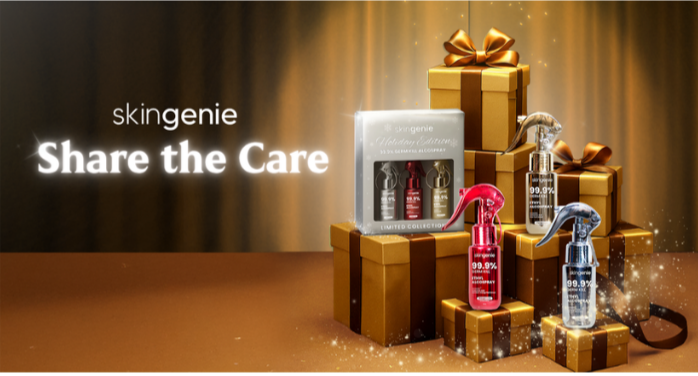 A holiday campaign highlighting SkinGenie essentials and limited Holiday Alcosprays as thoughtful, practical gifts, positioning the brand as a caring companion.