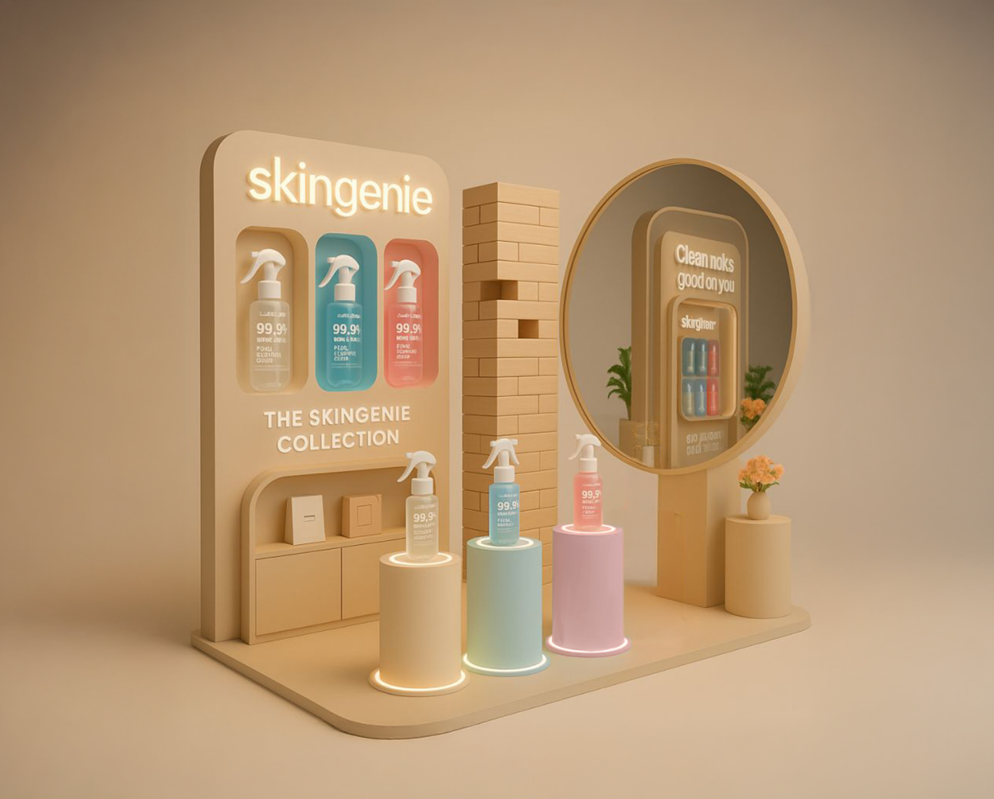 The booth design was developed to strengthen SkinGenie’s offline brand presence through an interactive and visually cohesive setup. The interactive booth showcased key products and encouraged engagement through product sampling and activities. Aligned with SkinGenie’s clean, vibrant aesthetic, it enhanced customer experience, visibility, and recall by letting consumers experience the products.